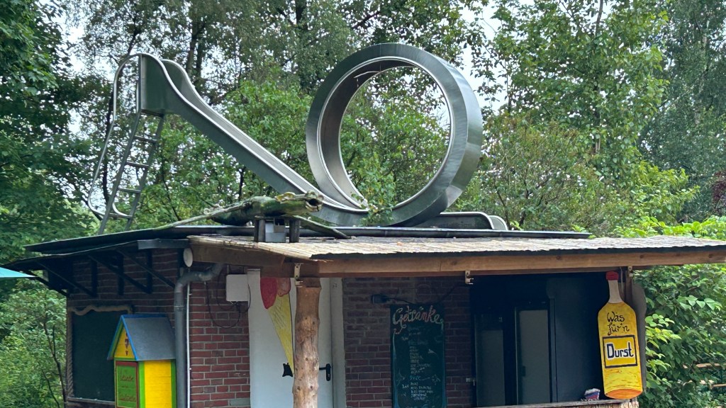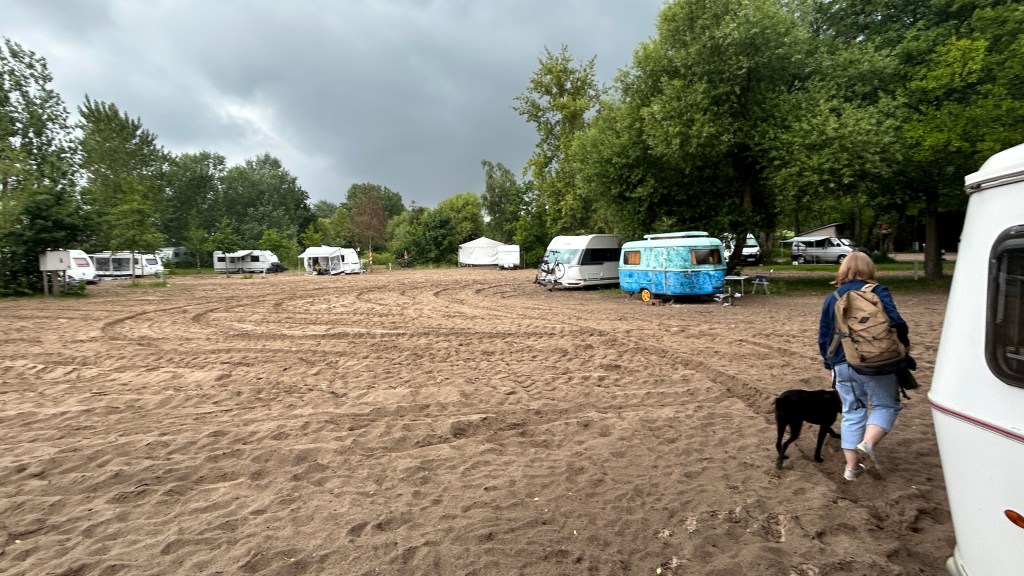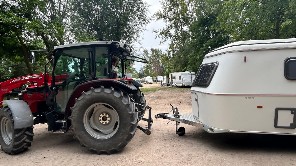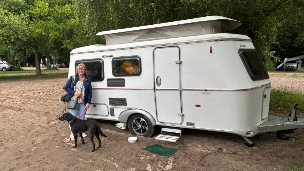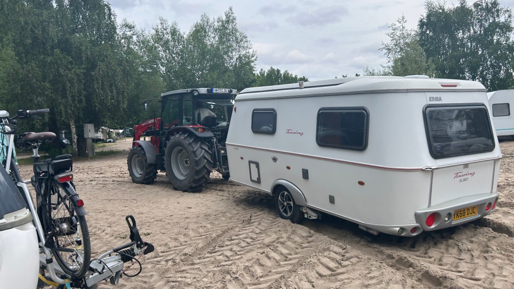 Campsite advertised itself as being on the beach of the Elbe river, which links Hamburg to the North Sea. I guess we hadn’t realized that the sand was so soft that pitching a caravan meant handing it over to a young man in a large tractor to pull it to the location! He then left us, just as we realized the van wasn’t on the level and there was nothing we could do about it!