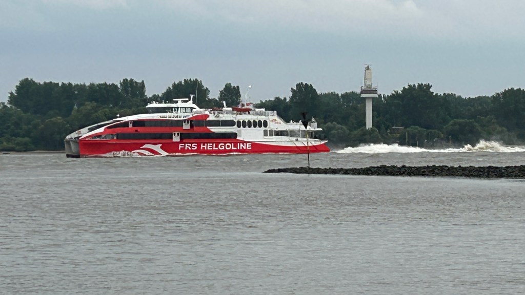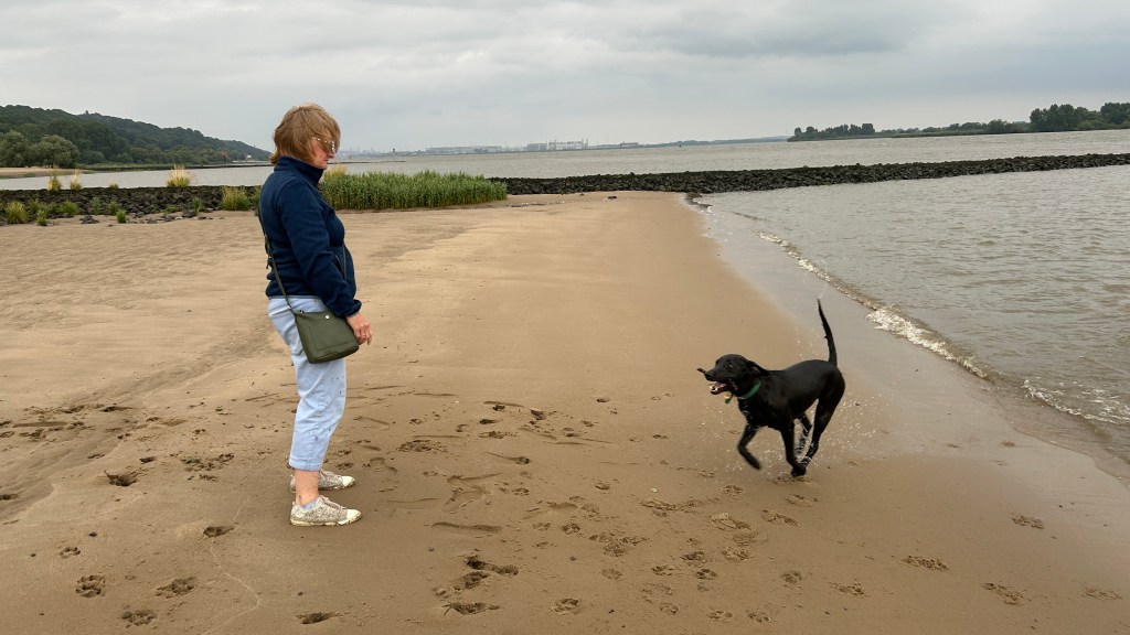 There was a nice walk, and swimming for Daisy, on the bank of the Elbe. You can see the container docks in the distance on this photo, and we saw one ship sail through as we walked.