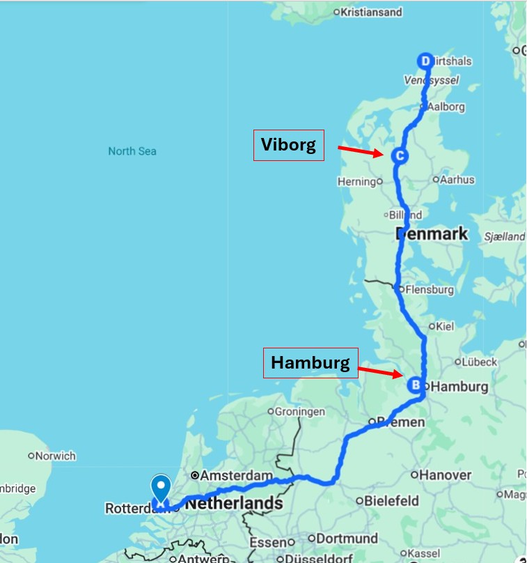 The overnight crossing to the Hook of Holland (close to Den Haag) meant we started driving at about 09:00. The drive to Hirtshals is 1,040 km, so likely over 12 hours with the ‘van, so we split it with a break in Hamburg, and then in Viborg in the north of Denmark.