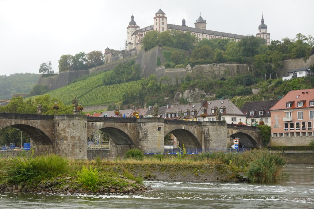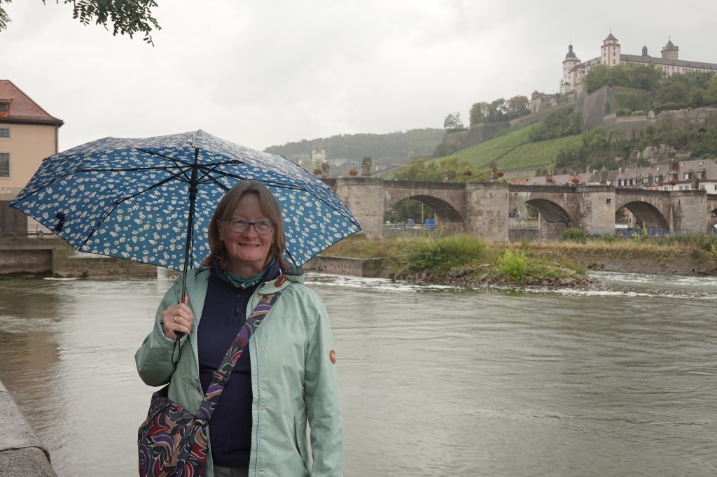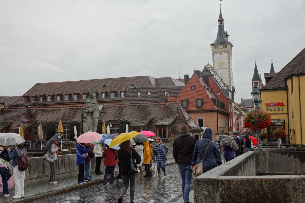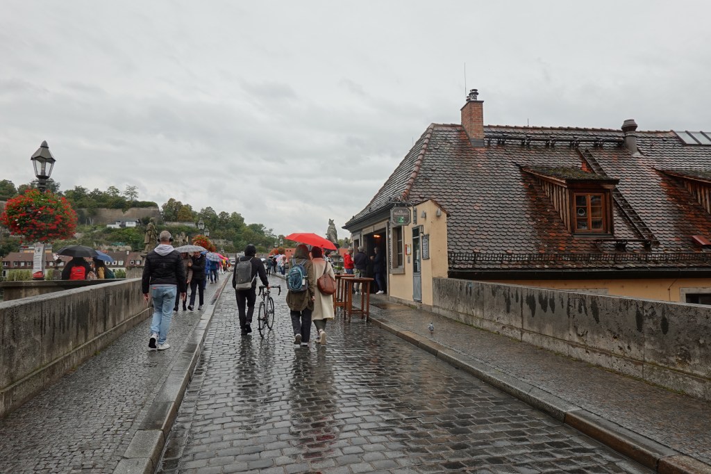 I had been to Wurzburg before on a business trip. I particularly remembered the bridge with the statues, and the bar on the right-hand side of the 1st photo below, drinking beer with colleagues. That was also in the rain, as I recall!