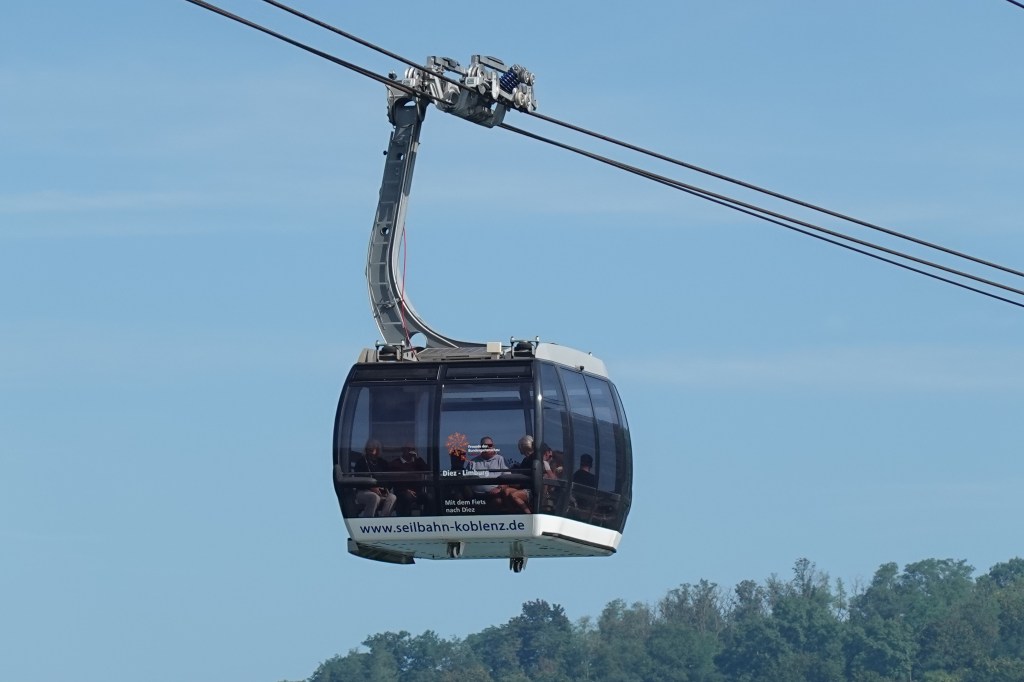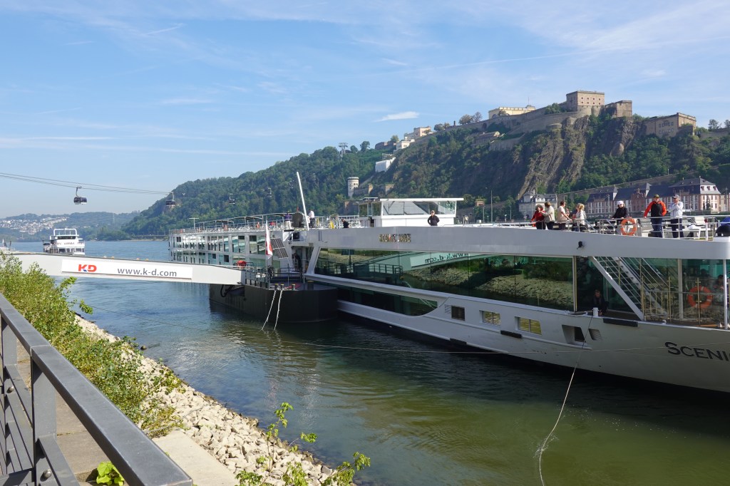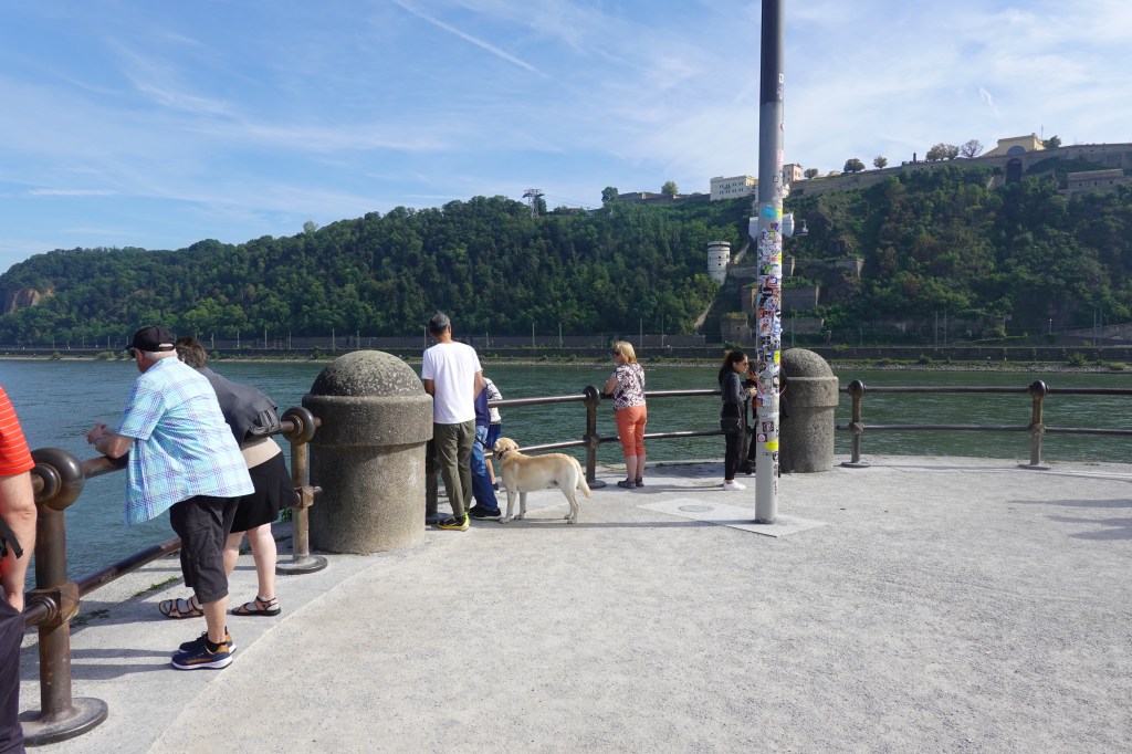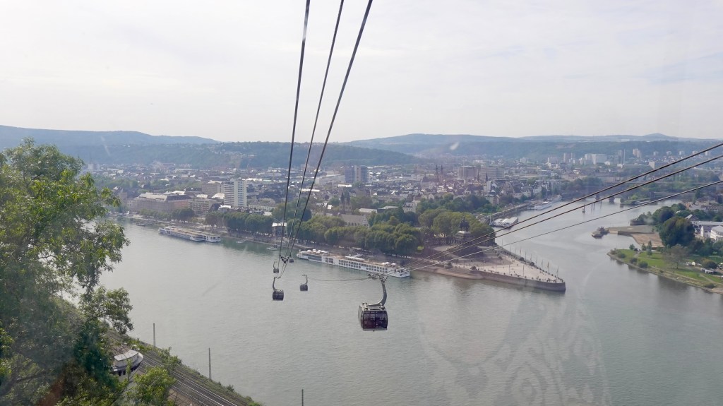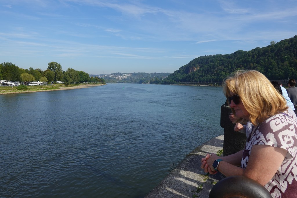 Koblenz is notable as where the River Rhine and Moselle meet, at a place known as Deutches Eck (German Corner). This is my photo, taken through the glass of the cable car (see Janet’s reflection in the picture!)