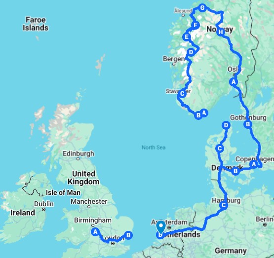 Well, this is the plan, taking the ferry to The Netherlands, through Germany, Denmark and up to a clockwise loop of Norway. Then a brief route through Sweden, back to Copenhagen, Germany and home. We are also taking Daisy the dog with us.